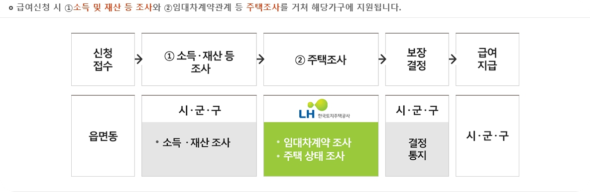 급여신청 시 ①소득 및 재산 등 조사와 ②임대차계약관계 등 주택조사를 거쳐 해당가구에 지원됩니다.