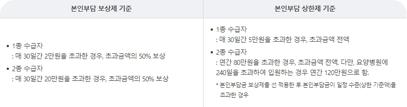 본인부담 보상제 및 본인부담 상한제가 있어 아래 기준을 초과하는 경우 초과금액을 국가가 지원합니다.