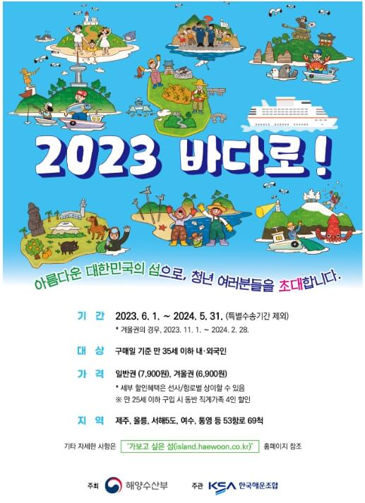 가보고 싶은 섬 홈페이지를 통해 2023년도 연안여객선 할인이용권 '바다로' 구매가 가능합니다. 내년 5월 31일까지 최대 50% 할인된 운임으로 이용이 가능합니다. 구매자 본인 포함 가족 최대 5인까지 할인혜택을 받을 수 있다고 하니 할인이용권 구매방법과 이용혜택까지 자세한 내용을 확인해 보신 후 온라인 통해 티켓 구매하셔서 즐거운 섬 여행을 계획해보세요. 바쁘신 분들을 위해 바로가기 링크 접속하시면 해당 사이트로 바로 연결가능합니다.