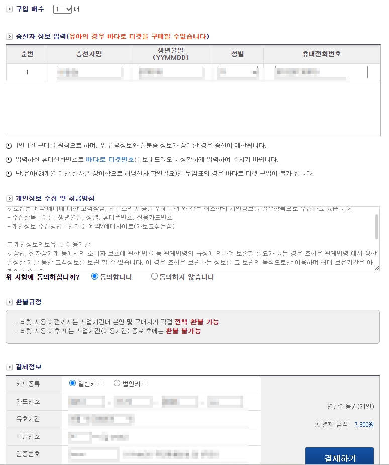 연간 가족권 구매도 마찬가지로 선택하신 후 구입매수 선택 후 승선자 정보 입력 하신 후 결제하기 버튼을 눌러서 진행하시면 됩니다.