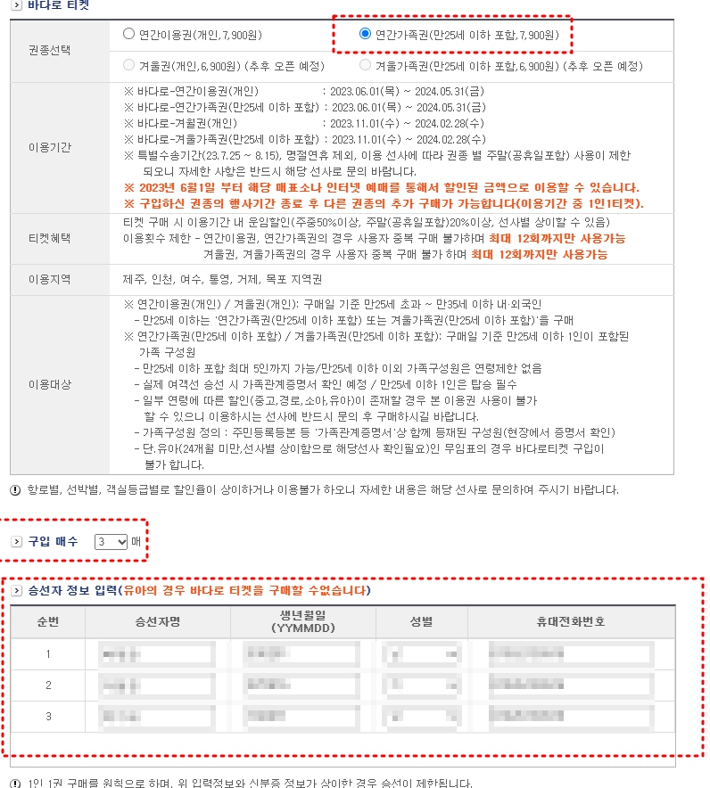 가입완료 후 티켓구매 메뉴를 선택하신 다음 연간(개인) 연간(가족) 원하는 티켓을 선택하신 후 아래에 구입 매수, 승선자 정보를 입력해 줍니다.
