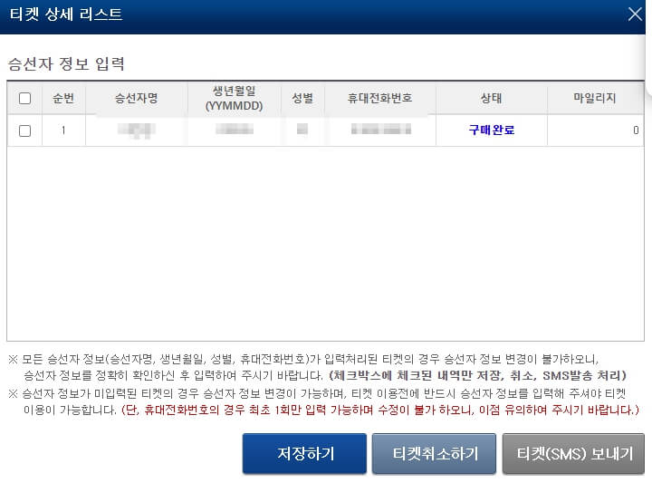 티켓정보를 눌러보시면 승선자 정보까지 확인 가능합니다.