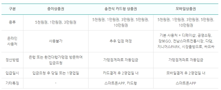 충전식 카드형 상품권이며 5천 원권, 1만 원권, 3만 원권, 5만 원권, 10만 원권으로 구성되어 있으며 소비자가 보유하고 있는 카드를 앱에 등록하여 충전하는 방식입니다.