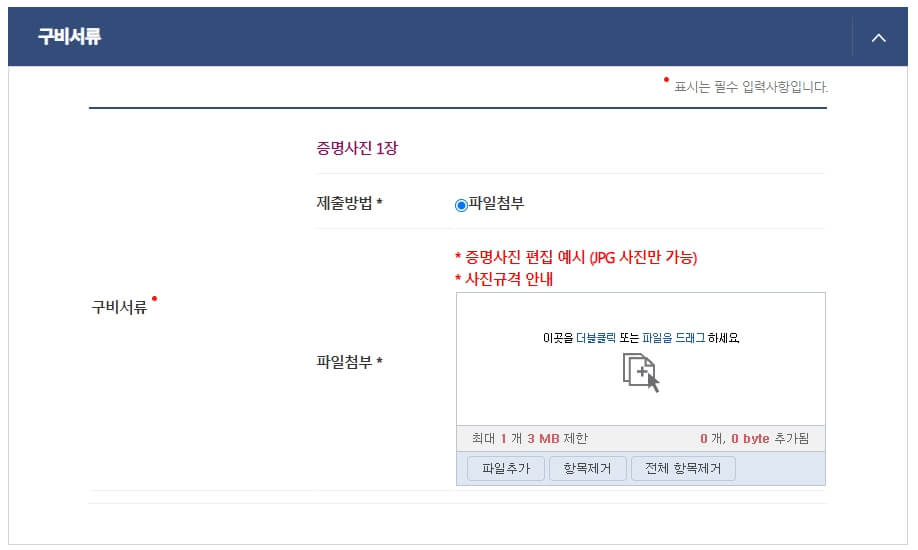 1.6개월 이내 촬영한 상반신 사진 1장 ( 3.5x4.5cm 의 모자 등을 쓰지 않는 상반신 사진)
