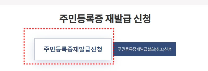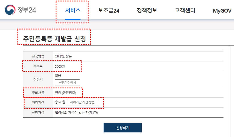 정부24 홈페이지에서 주민등록증 재발급 신청 메뉴를 선택하신 후 신청하기 버튼을 눌러 줍니다.