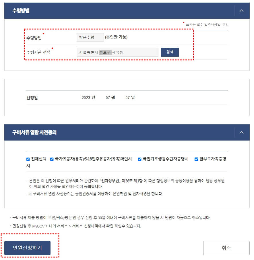 수령방법,수령기관을 선택하신 후 사전동의 체크하신 다음 민원신청하기 버튼까지 선택하시면 됩니다. 주민등록증 재발급은 처리기간이 20일 정도 소요됩니다.