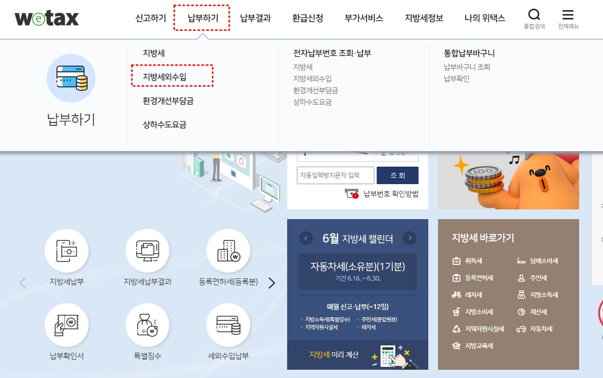 위택스 홈페이지 상단납부하기 메뉴에서 지방세외수입 메뉴를 선택합니다. 그리고 오른쪽의 전자납부조회 납부 메뉴에서 지방세외수입을 선택합니다.