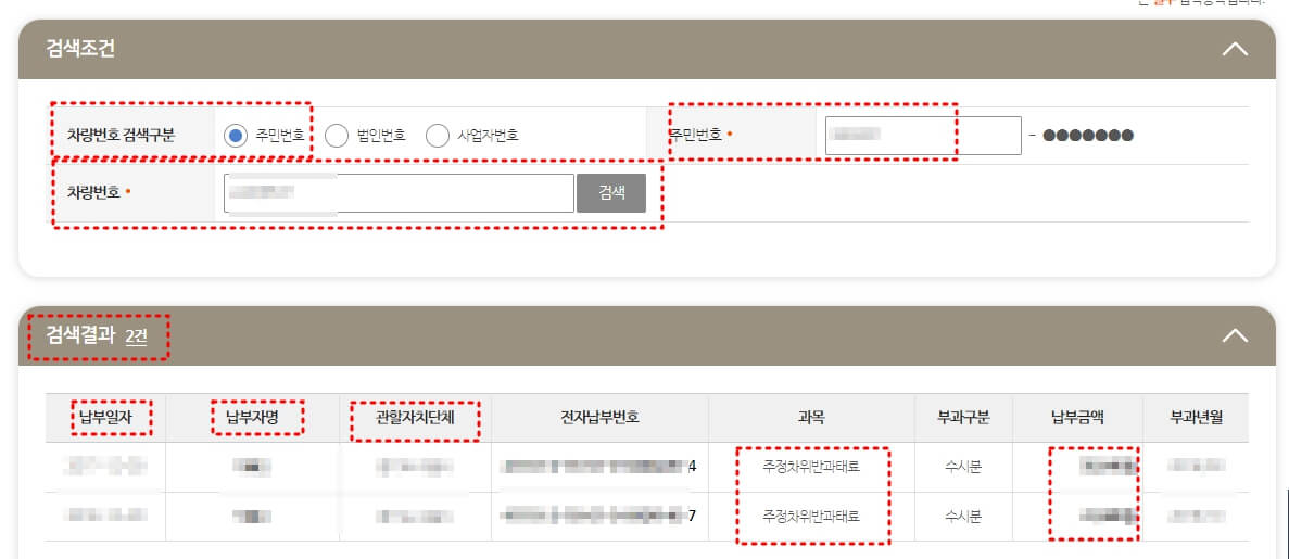 차량번호 조회를 선택 후 하단 개인정보를 입력 한 다음 검색을 눌러주면 현재 미납된 내역 또는 이미 납부한 내역 확인 가능합니다.