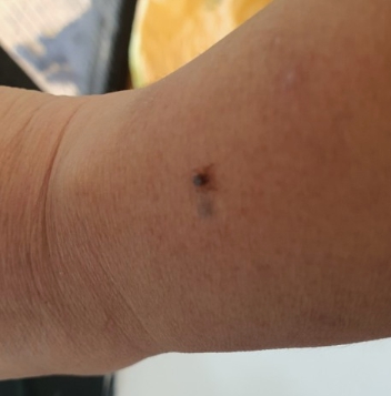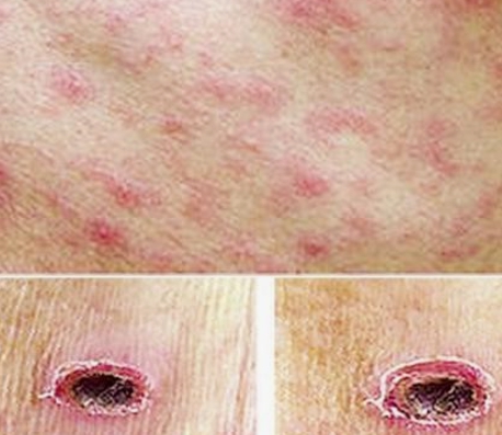 발열이 시작되고 1주일 정도 지나면 암적색의 반점상 구진이 몸통에서 나타나 사지로 퍼져 나가며 수일 내에 사라집니다. 통증이 없어 눈에 띄지 않을 수 있어 모르는 경우가 많습니다. 하지만 시간이 경과함에 따라 광범위한 발진으로 발생될 수 있습니다.