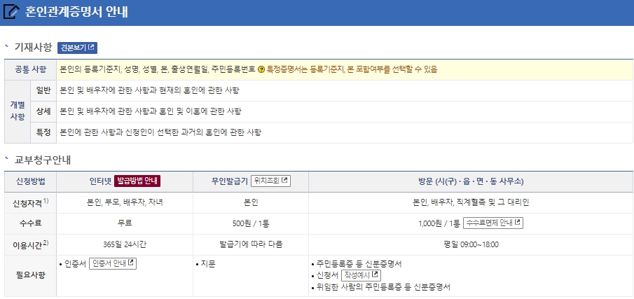 - 특정: 본인에 관한 사항과 신청인이 선택한 과거의 혼인에 관한 사항