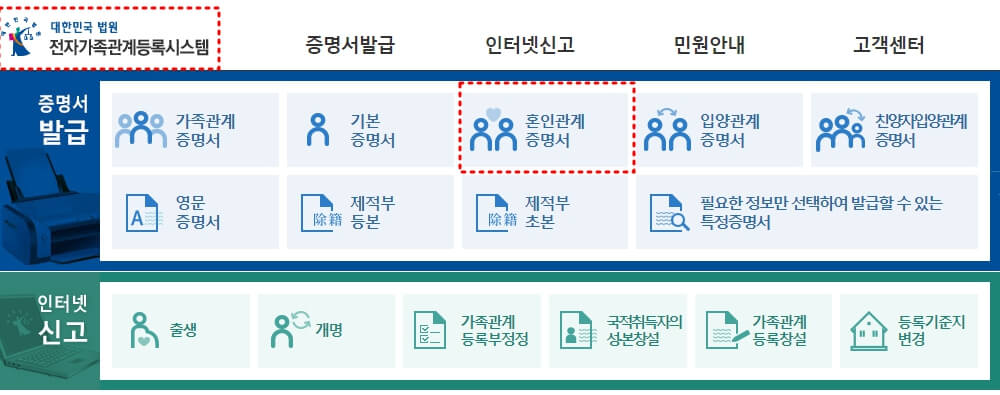 전자가족관계등록시스템 홈페이지 메인메뉴 증명서 발급 메뉴에서 혼인관계증명서를 클릭합니다.