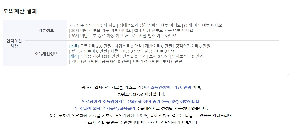 근로소득 250만원,주거용 재산 1천만원 2가지 항목만 입력 후 계산해보니 저의 소득인정액은 175만원, 중위소득 32% 산출되었습니다.