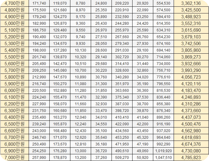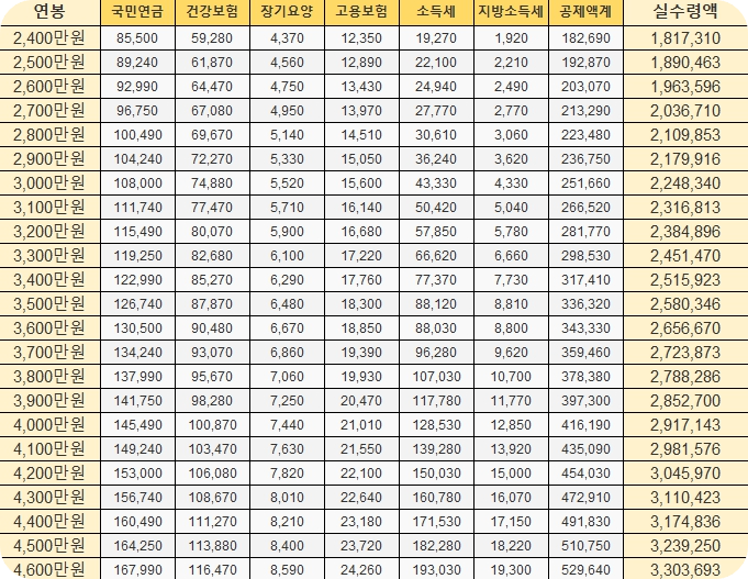 2023년도 연봉 금액에 따른 실수령액 금액표입니다. 연봉에서 여러 세금을 제외하고 나머지 금액을 받으시기 때문에 공제항목 확인 후 실수령액 금액 참고하셔서 확인하세요.
