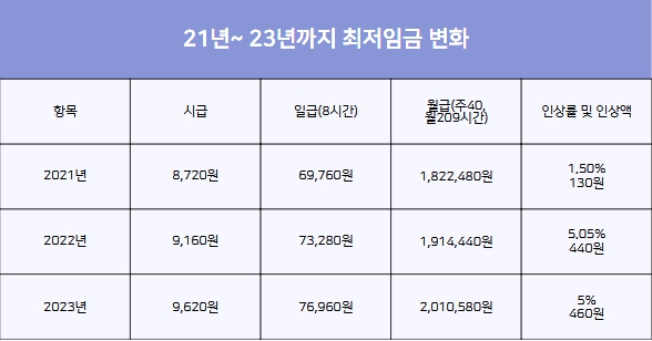 지난 2021년부터 올 2023년까지의 최저임금 변동사항입니다.